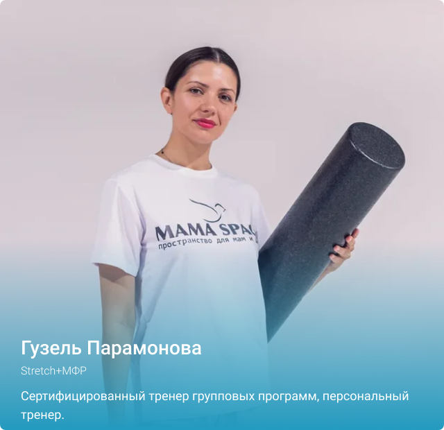 В клубе MamaSpace ведет тренировки по направлению Stretch+МФР. Это сочетание техники миофасциального релиза и упражнений на гибкость, которые дополняют друг друга и позволяют увеличить амплитуду движения суставов без вреда для опорно-двигательного аппарата.